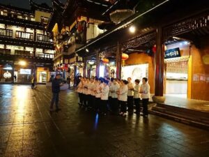 ↓ 豫園のレストランの閉店後の夕礼のようです。店の前でするんですね。