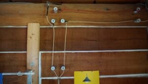 お部屋の中の電気の配線は露出状態。「碍子(がいし)」と言われる陶器製の絶縁体で電気の線を